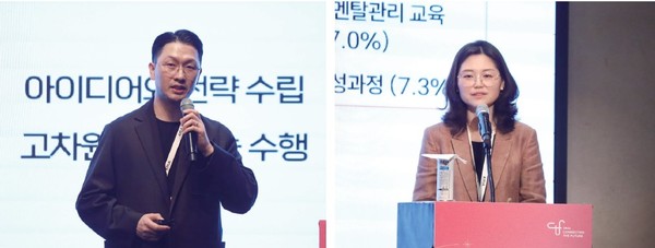 ▲ 박경만 KMA 인재개발센터 센터장(좌측)은 미디어 분석과 VOC 데이터를 바탕으로 정리한 HRD 트렌드를 공유했고, 이재영 이화여 대 교육공학과 교수(우측)는 설문조사와 여러 연구 내용을 바탕으로 기업교육 현황과 글로벌 HR/HRD 트렌드를 진단했다.다음으로 1부(Insight 세션) 중 기업교육 현황과 국내 HRD 트렌드를 정리/분석한 강연을 정리해보면 먼저 이재영 이화여대 교육공학과 교수가 발표했는데 그는 설문조사 결과를 토대로 “올해 HRD 현장에선 직무 전문성 강화와 핵심인재 육성이 최우선 과제였고 디지털 리터러시와 리스킬링이 뒤를 이었으며, 교육운영 형태를 보면 집합교육이 여전히 가장 많으나 그 비율은 37%로 떨어졌으며 이러닝, 실시간 온라인 학습, 블렌디드러닝, 러닝저니 등의 비율이 상승했다.”라고 설명했다. 아울러 그는 “AI 성숙도에 관한 자료를 보면 AI 도입 및 유관한 사내교육 비율에선 국내기업과 해외기업의 차이가 크지 않지만 AI를 도입하지 않았다는 국내기업 비율은 상대적으로 높았다.”라며 국내 산업계에 AI 활용력 향상을 위한 노력이 많아지길 희망했다. 이어서 그는 직급별 AI 사용 현황으로 넘어갔는데 “차장·부장 등 중간관리자급이 임원보다 AI 활용이 낮았다.”라며 AI 교육에서 특정 직급의 소외를 유의하길 당부했고, HRD의 변화는 ‘효율’에서 ‘재정의’로 나아가야 한다고 강조했다. AI로 현재의 업무·학습을 재설계하는 수준까지 고민해야 진정한 HRD의 AX를 이뤄낼 수 있다는 뜻이다.
