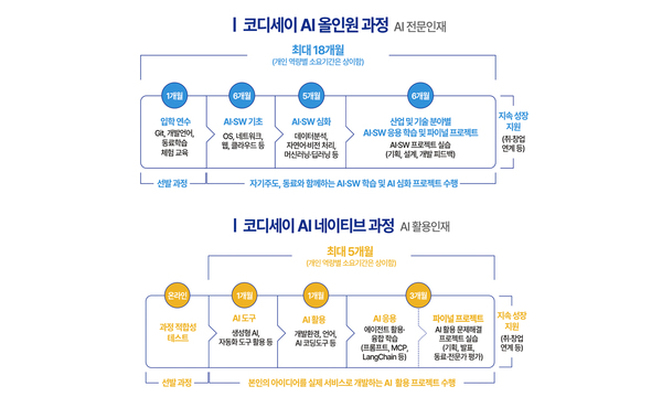 맞다. 코디세이에는 2개 과정이 있는데 하나는 ‘AI 올인원 과정’으로 최대 18개월 동안의 장기 과정이며, 목표는 ‘AI 전문인재’ 양성이다. 프로세스도 말씀드리면 먼저 입학 연수(1개월) 단계에선 Git, 개발언어, 협업 도구 등을 활용해 개발 환경을 직접 구축하고, 코드와 시스템의 동작 원리를 이해하게 한다. 이를 통해 교육생들은 단순 구현을 넘어 오류의 원인을 추적하고 해결할 수 있는 기초 개발 역량을 갖추게 된다. 다음으로 AI·SW 기초학습(6개월) 단계에선 운영체제, 자료구조, 네트워크, 데이터베이스, 클라우드 등 소프트웨어의 핵심 구조를 학습한 다음 실제 서비스를 설계·개발·배포하는 경험을 쌓는다. 해당 경험을 통해서는 AI API를 연동한 서비스를 개발하는 수준에 도달할 수 있다. 다음으로 심화학습(5개월) 단계에선 데이터 분석, 자연어 처리, 머신러닝·딥러닝 등 핵심 AI 기술을 다루며, 데이터 전처리부터 모델 설계, 성능 개선까지 전 과정을 수행한다. 이를 통해서는 실무 데이터를 기반으로 문제를 정의하고 AI로 해결할 수 있는 역량을 갖출 수 있다. 마지막의 응용학습(6개월) 단계에선 제조, 금융, 헬스케어 등 다양한 7대 도메인의 실제 문제를 기반으로 산업 현장형 프로젝트를 수행하는데, 문제 정의부터 데이터 수집, 모델 설계, 서비스 배포 및 운영까지 전 과정을 주도하고 도메인 전문가와 교류·협업하며 실질적인 비즈니스 임팩트를 만들어내는 경험을 하게 된다. 이상의 여정을 마친 교육생들은 산업 현장에 즉시 투입 가능한 AI 전문 엔지니어로 거듭난다.